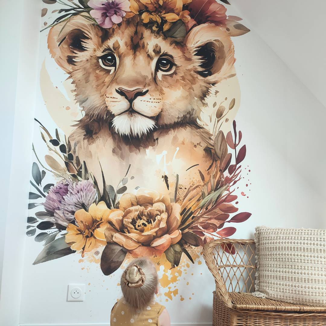 Papier peint enfant panoramique Lion Watercolor couronne de fleurs