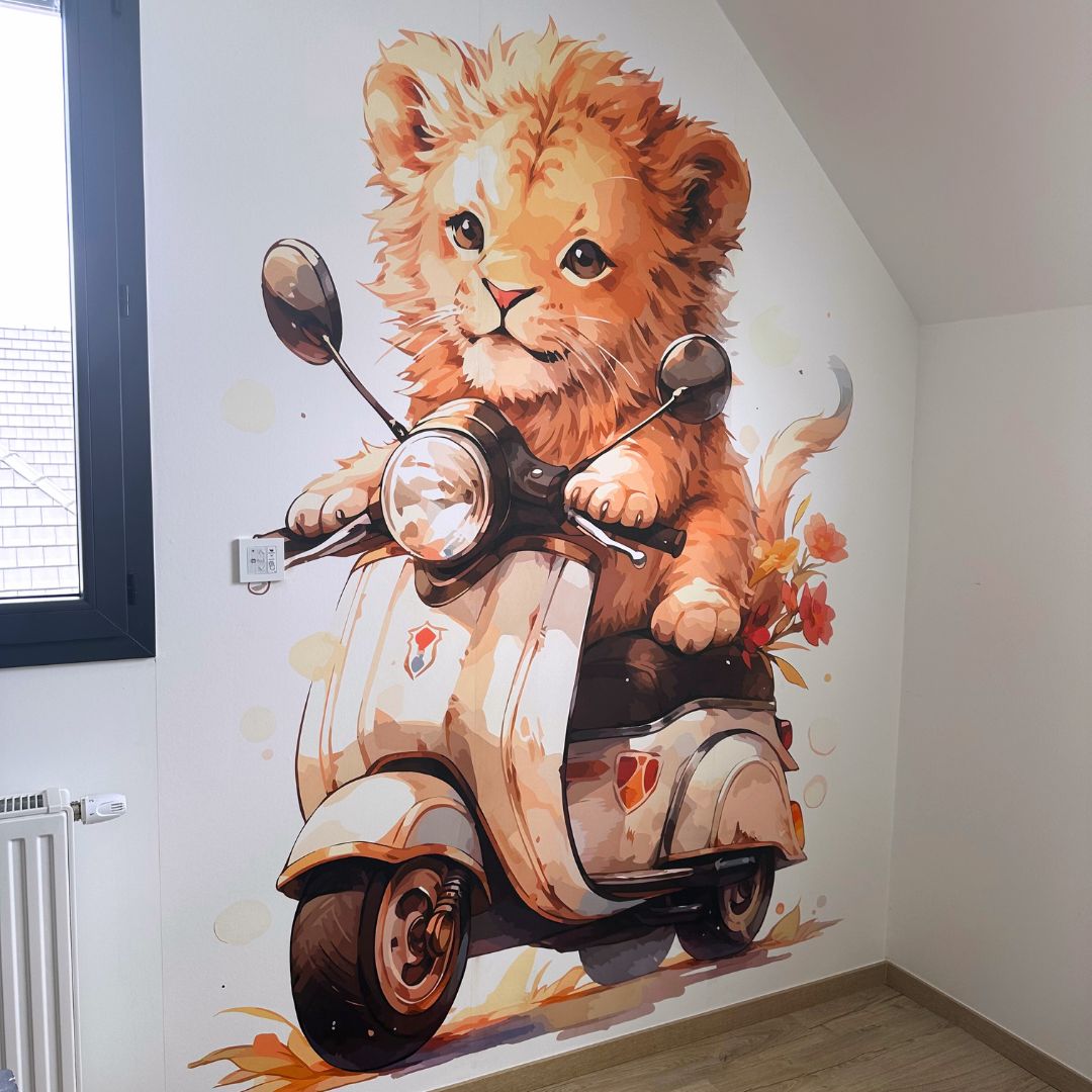 Panorama Kindertapete Löwenbaby mit seinem Motorrad