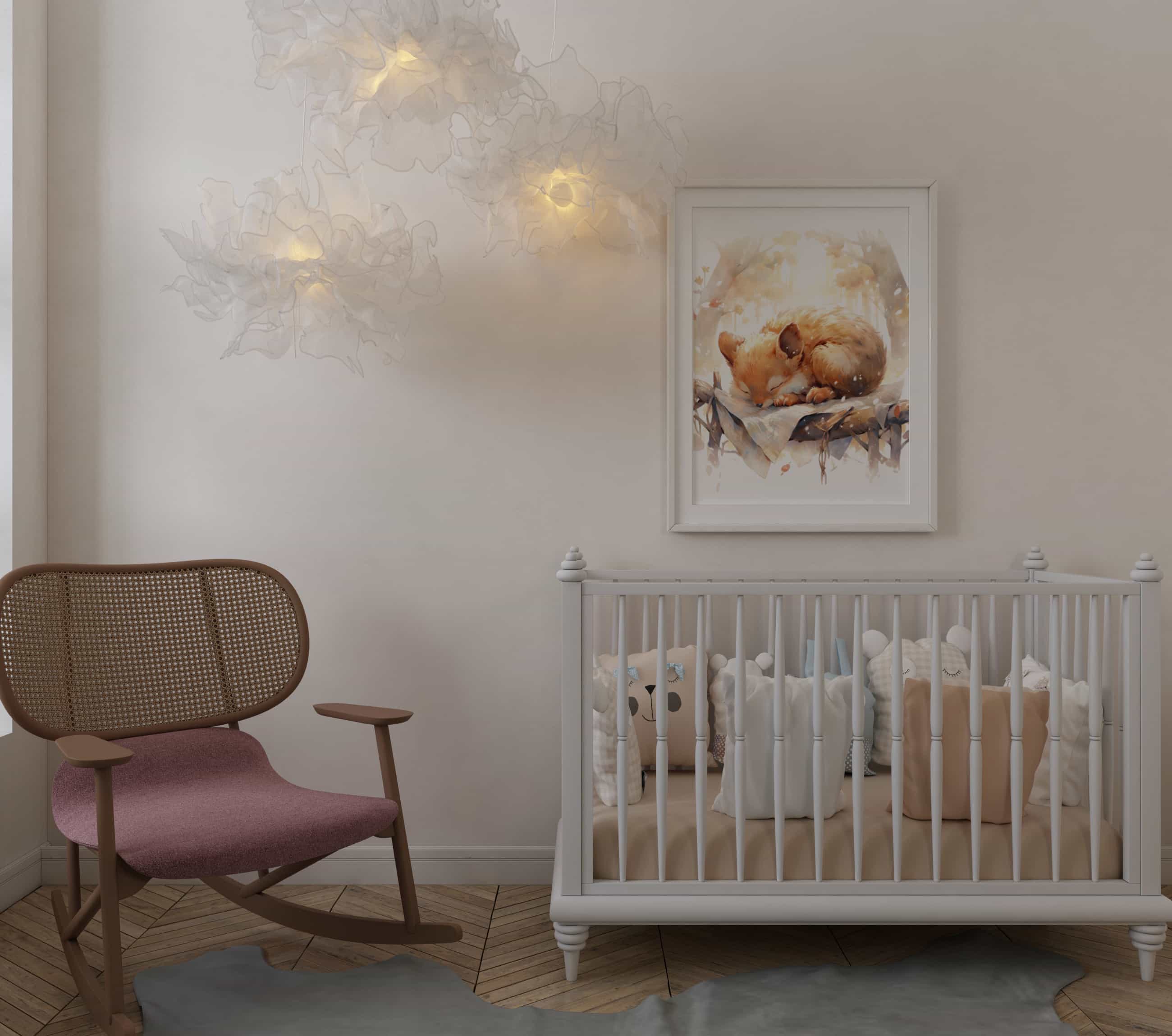 N’hésitez pas à associer les affiches par 2 ou 3. Cela permet de faire écho au motif principal du papier peint que vous aurez choisi, d’assurer un bon équilibre visuel et de créer un point focal harmonieux qui apporte charme et personnalité à la chambre de bébé.